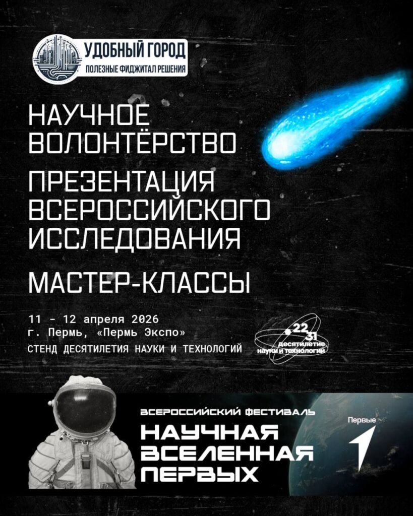 ⏱11-12 апреля Мастер-классы, исследования «Удобного города» в рамках Всероссийского фестиваля «Научная Вселенная Первых», Пермь